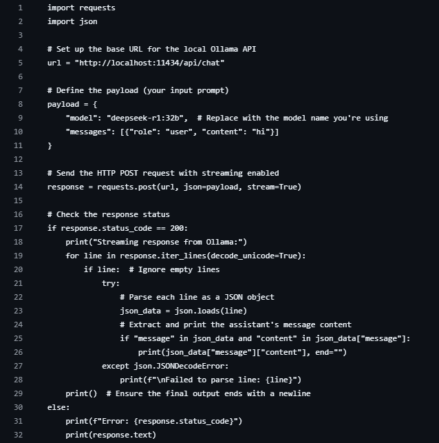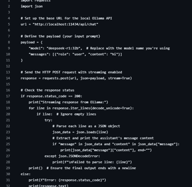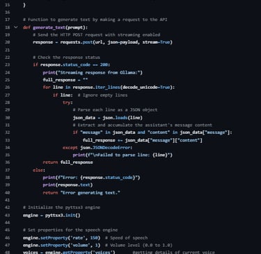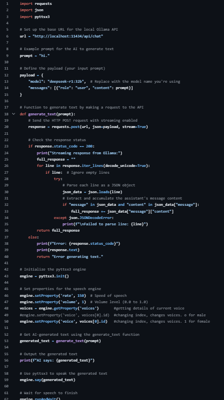 Starting this project I knew I wanted to use the LLM known as deepseek due to it being opensource and able to be ran locally. I was able to download it and run it using Ollama. After the AI model was downloaded and configured I downloaded the latest version of python and pip. Once that was done requests pyttsx3, PyAudio, Speech_recognition and json had to be installed to allow for text to speech, HTTP requests and speech recondition. Together all of these scripts can be ran together to make the Model understand what I say, process the statement or question and speak to me using an audio file.