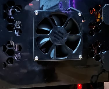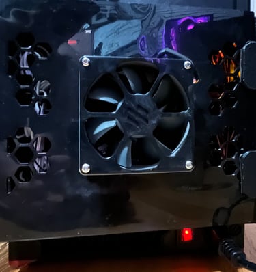 Due to my constant tampering with this machine, I decided to make a backdoor to allow me to open the electronics bay instead of unbolting the whole system. This back door includes a Noctua fan for motherboard cooling, a mini 3d printed frame, and the door itself with its hinges.
