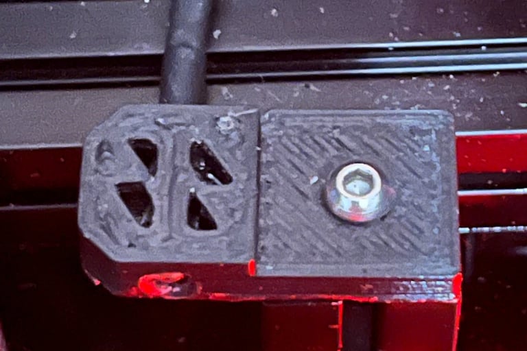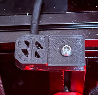 To prevent user error when assuming the amount of filament in a spool needed for a print, a filament runout sensor allows the printer to let itself know when more filament is needed to complete a print. The runout sensor I am using is pre-made but allows the machine to know if the filament is feeding into the extruder properly and if there is filament in the sensor through the use of an encoder and a limit switch. These 2 sensors allow me to write code to tell the printer whether filament is in the machine and if it's extruding at the expected rate. This sensor is mounted on the back of the printer on top of the printers back door.