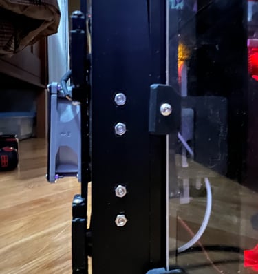 After ~200 print hours, the 3D-printed hinges on the front door of the machine snapped. Due to this, I modified a design created by Leiwandizer by making bigger internal holes for longer m3 heat-set inserts. These hinges allow for the bolt to be the pivot point of the hinge instead of being what rotates. On top of using different door hinges, I created clips to go on the edges of the new doors to cover the sharp edges of the panels. This same modification was copied on the back of the machine to allow for easy access to the electronics panel. While doing this upgrade I replaced one of my side panels with a smoked acrylic panel with an RGB panel behind it to diffuse the light. This modification allows the chamber of the printer to be visible through the camera.