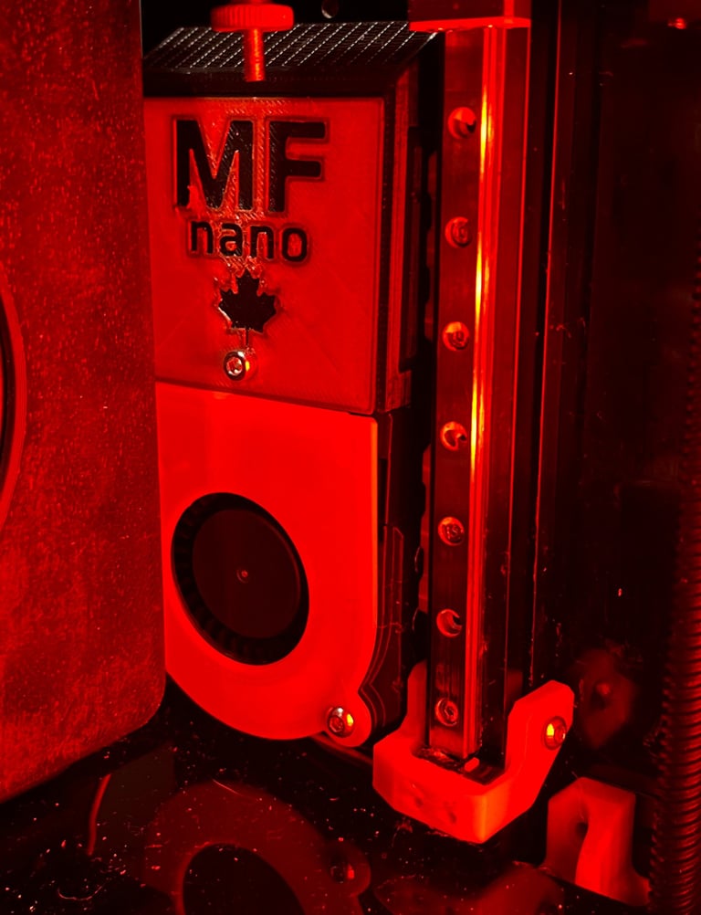 The carbon filter on this printer allows for the VOCs expelled from toxic filaments to bind with the carbon inside of this filter. It uses a 5015 blower fan to direct the toxic air within the chamber to be cleaned.
